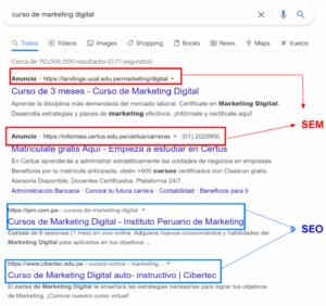 Una forma clara y efectiva para diferenciar si un resultado es producto del SEO o del SEM, es observar si en la parte superior de la búsqueda se describe la palabra anuncio.